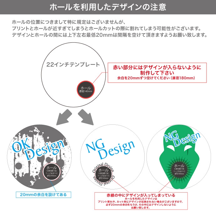 ※ホールとプリントの間に間隔がほとんどないデザインにつきましてはデータのサイズや位置の変更をご依頼する場合がございます。