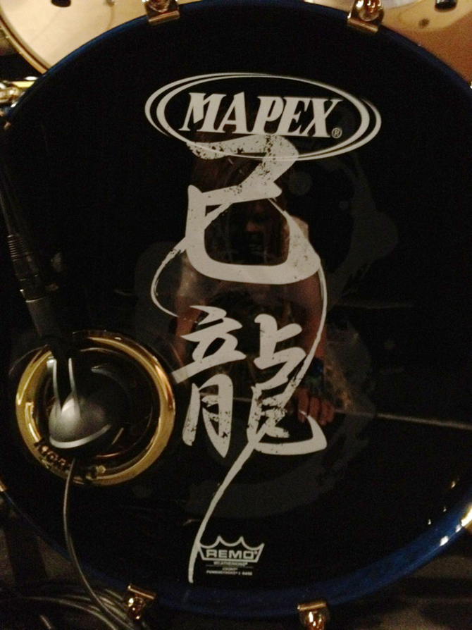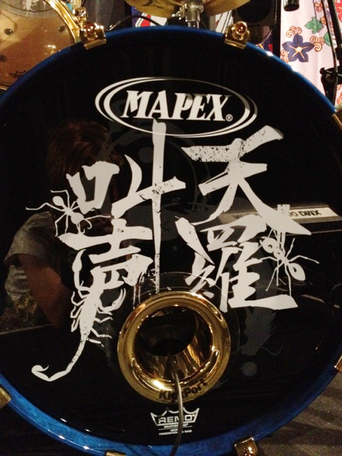 ドラムヘッドを制作する際にデザインデータは己龍様の方でご用意いただきまして、MAPEXのメーカーロゴにかかるようにオリジナルロゴとのご要望でバスドラムヘッドにプリントさせていただきました☆